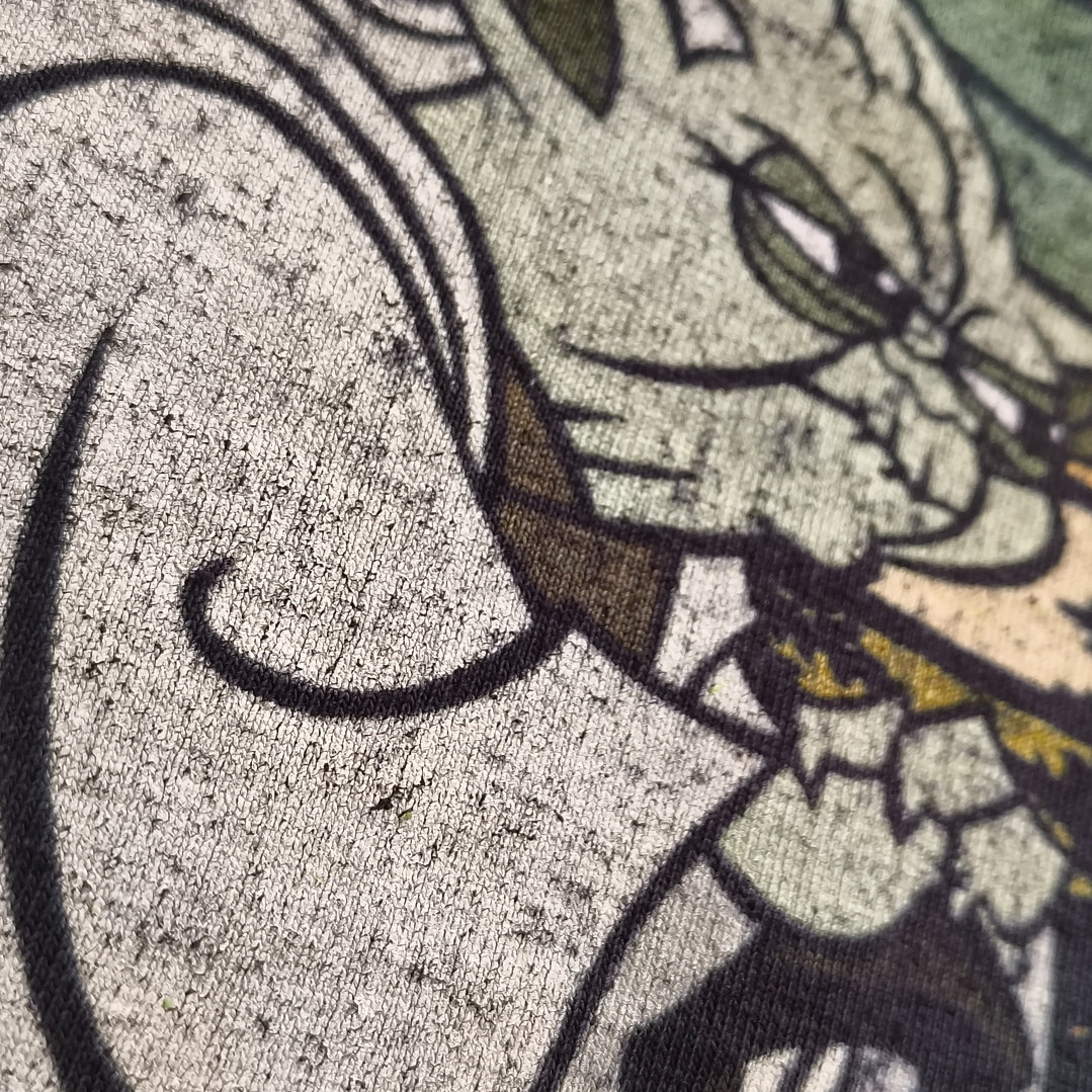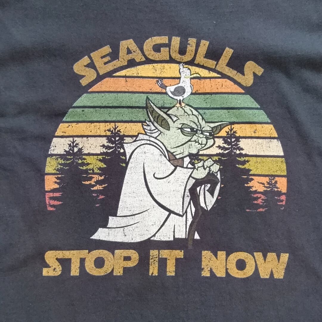 そんなアニメ版ヨーダが、レトロな夕焼けカラーの背景に「SEAGULLS STOP IT NOW」の文字と共に描かれたインパクトある1枚。プリントには若干のカスレが出ており、まるで長年愛されてきたかのようなヴィンテージライクな風合いを演出しています。