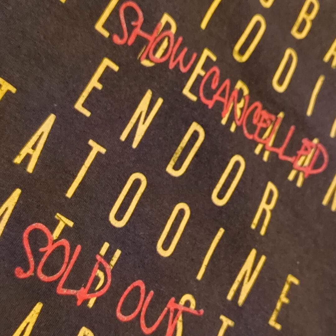 フロントにはモーダル・ノーズの5人が演奏しているレトロなバンドTシャツ風のアートがプリントされており、「LIVE AT MOS EISLEY(モス・アイズリー公演)」という文字が大きくデザインされています。バックプリントには、ツアーで訪れる予定だった銀河各地の惑星名がズラリと並びますが、オルデラン(Alderaan)は「SHOW CANCELLED(公演中止)」、デス・スター(Death Star)は「SOLD OUT(完売)」と、ユーモアたっぷりな演出も。