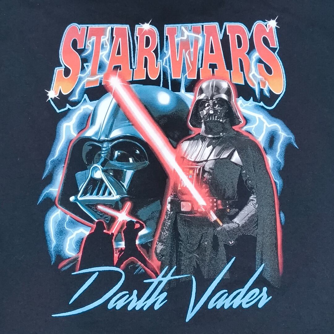スターウォーズファン必見!あの最強のダークサイド戦士・ダース・ベイダーがフロント全面に大胆プリントされた、インパクト抜群のヴィンテージ風Tシャツが入荷しました。光るライトセーバーを構える迫力のベイダー、背後には稲妻が走るエネルギッシュなビジュアル、そして胸上部にあしらわれたグラデーションの「STAR WARS」ロゴが絶妙なアクセントに。スターウォーズファンはもちろん、映画Tやアメカジ、ストリートスタイルがお好きな方にもおすすめの一枚です。プリントの色使いもレッド×ブルー×ホワイトのコントラストが映える絶妙な配色。古着としてのコンディションも良好で、特に目立ったダメージや汚れは見当たりません。1枚でもインナーでも主役級に活躍してくれる存在感あるTシャツです。お探しだった方、この機会にぜひご検討ください!