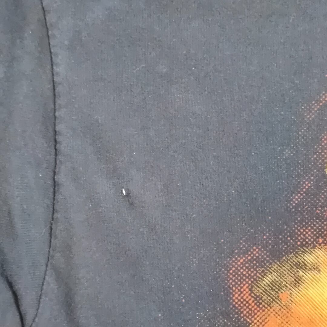 こちらは映画「スター・ウォーズ」シリーズより、続三部作のヒロイン「レイ(Rey)」がデザインされたグラフィックTシャツです。レイがジェダイの紋章を掲げ、まるでフォースの象徴のような構図で、まわりにはオレンジ~イエローのエフェクトが爆発的に広がるデザイン。ブラックのボディにこのビジュアルが映える、インパクト抜群の一枚です。サイズ表記はタグ欠損のため不明ですが、着用感としてはS~Mに感じます。なお、画像にあるようにフロント中央下部と左胸あたりにわずかな擦れ、左袖に薄い色抜けのような跡が見られますが、目立つようなダメージや破れはなく、古着慣れされた方であれば問題なく着用可能なコンディションです。