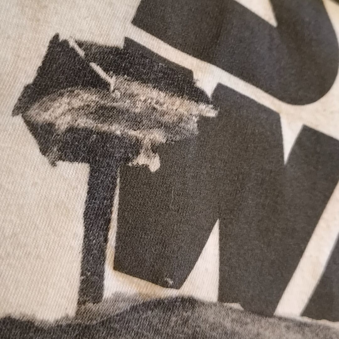 フランスの人気ファッションブランド「celio*(セリオ)」とSTAR WARS(スター・ウォーズ)の公式コラボTシャツです。伝説的賞金稼ぎ「ボバ・フェット」がフロントに大きくプリントされており、頭上にはフラッシュに反応する特殊素材の「STAR WARS」ロゴが施されたインパクトある1枚。グレー系の水墨画風グラフィックが渋く、ヴィンテージライクな風合いが特徴です。裾には「STAR WARS × CH YOU」のタグ付きで、細部までこだわりの詰まった仕上がりとなっています。シルエットはやや細めのMサイズ。目立つダメージとして、フロント・袖・バックに数ヶ所小さな穴があります(写真をご参照ください)。また、プリント部分の一部にヒビ・はがれがあります。古着にご理解のある方、USEDの味わいを楽しめる方におすすめです。