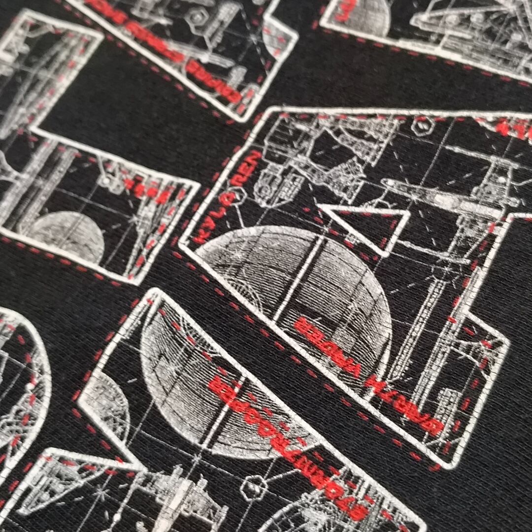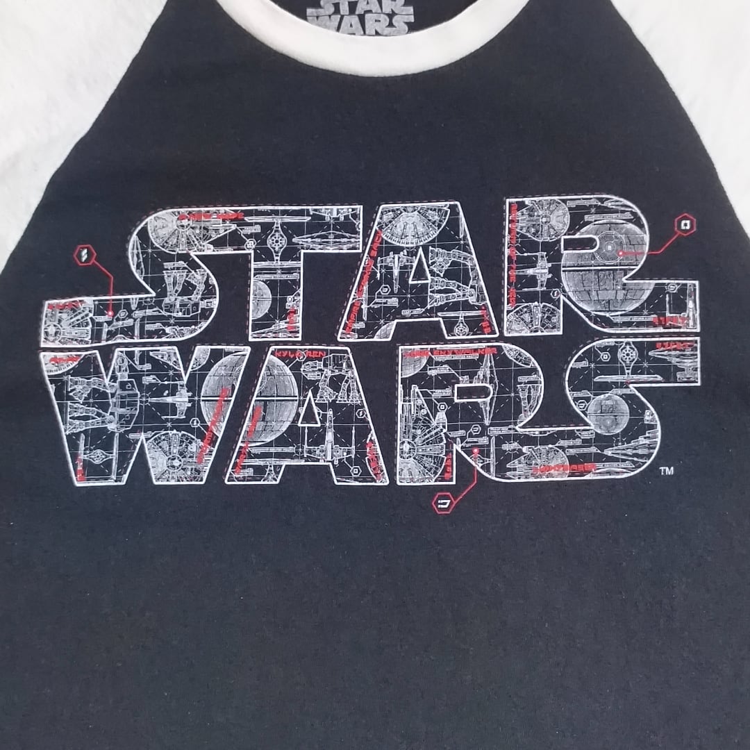 ディズニーパーク限定で販売された貴重なラグランスリーブTシャツです。ブラックボディにホワイトの袖が映えるラグランタイプで、中央には大迫力の「STAR WARS」ロゴが大胆に配置。ロゴ内にはデス・スターやタイ・ファイター、Xウイングなどの設計図風グラフィックが緻密に描かれており、レッドのラインがアクセントとして効いています。Disney Parksオリジナルタグが襟元にプリントされており、ファンにはたまらない公式ライセンス品です。ユニセックスで着用可能。古着としての若干の使用感はあるものの、目立つダメージや汚れは見当たらず、まだまだ長くご着用いただけます。STARWARS × ディズニーパーク × ラグランというレア要素が揃ったアイテムはなかなか出回らないので、この機会にぜひどうぞ。
