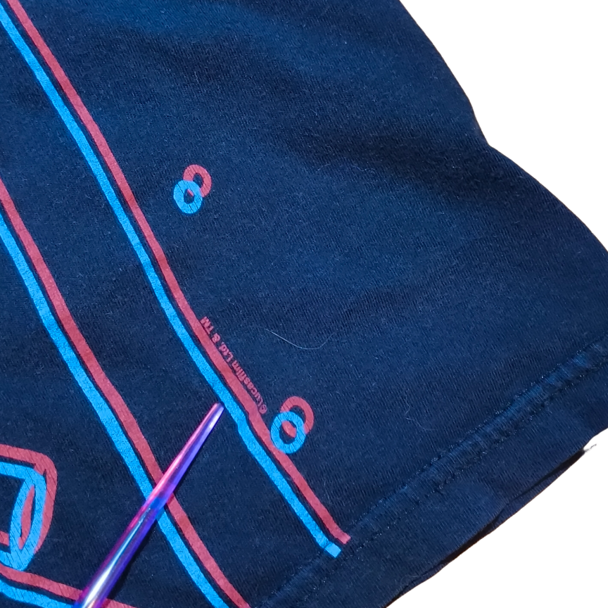 JUNK FOOD(ジャンクフード)とSTAR WARS(スターウォーズ)のコラボTシャツ、ボバ・フェット(Boba Fett)デザインです。赤青のアナグリフ3D風プリントが印象的な1枚で、立体感あるグラフィックがレトロかつ近未来的な雰囲気を演出します。タグは両面タグ付きで、メインはスカルウィングロゴ、内タグに「Made in Honduras」「サイズM」「100% Cotton」などの表記あり。カラーは実物はやや色褪せたヴィンテージブラック系で、古着らしい風合いが感じられます。©LFL表記入りの正規ライセンス品、JUNK FOODらしいグラフィックセンスが光るコレクタブルな一着です。サイズ感はユニクロM相当、標準的な日本人男性やオーバーサイズに着たい女性にもおすすめです。