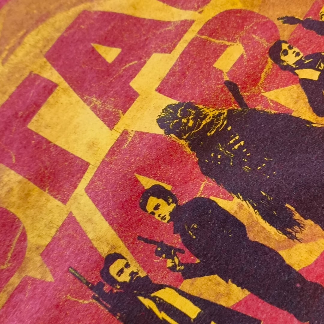 スターウォーズ映画『ハン・ソロ/スター・ウォーズ・ストーリー』(2018年公開)に登場する主要キャラクターが勢揃いしたインパクト抜群の公式Tシャツです。フロントにはハン・ソロ、キーラ、ランド・カルリジアン、L3-37、ベケット、そしてチューバッカが並んだシルエットが大胆にプリントされ、背景にはファルコン号を模した円形のイエローグラフィックと「STAR WARS」ロゴが鮮やかに浮かび上がります。カラーはややメランジがかったレッドで、ポップでありながら落ち着いた印象もあり、デニムやスニーカーとの相性も抜群。サイズ表記はSサイズ。ユニセックスで着用可能なシンプルなボックスシルエット。着丈や肩幅も標準的な作りなので、メンズのMサイズ相当としてもおすすめできます。ハンソロのアイテムは数が少ないため、お探しだった方はぜひこの機会にどうぞ。