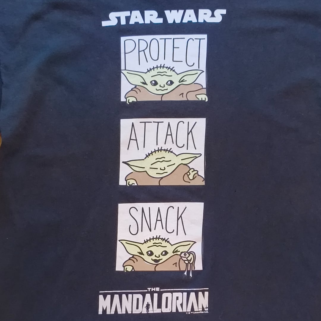 STAR WARS(スター・ウォーズ)の人気シリーズ「マンダロリアン」に登場するグローグー(通称ベビーヨーダ)が描かれたキャッチーなプリントTシャツです。デザインは「PROTECT・ATTACK・SNACK」の3コマ構成で、かわいらしいグローグーの表情がポップに表現されています。小さなダメージ(ピンホール)がありますが、着用には大きな支障はなく、古着に慣れている方であれば問題なく着用いただけます。ビッグシルエットすぎず程よいゆったり感なので、ユニセックスでおすすめです。